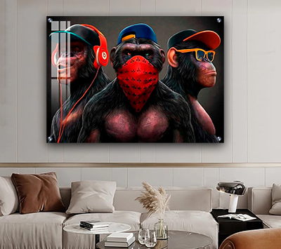 A-516 תמונת זכוכית או קנבס מודרנית של שלושה קופים לסלון או חדר שינה