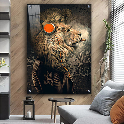 A-82 תמונה של אריה עם סיגר ואוזניות לסלון או חדר שינה