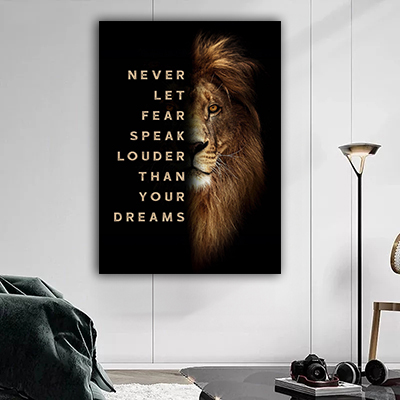 A-90 תמונה של אריה עם משפט השראה באנגלית על קנבס או זכוכית