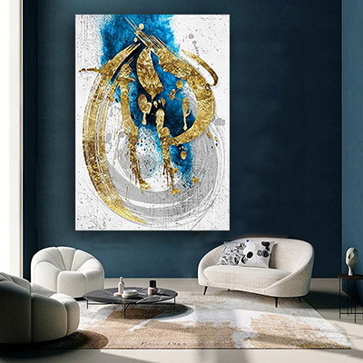AB-72 תמונת אבסטרקט יוקרתית בגווני כחול, לבן וזהב על זכוכית או קנבס