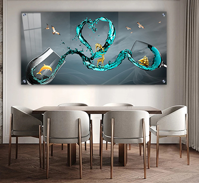 K-15 תמונת אבסטרקט מודרנית עם כוסות יין מתמזגות ואיילים בזהב על זכוכית או קנבס
