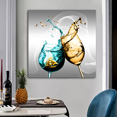 K-16 תמונת אבסטרקט מודרנית עם כוסות יין מתמזגות על זכוכית או קנבס