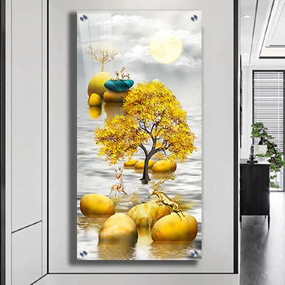 N-29 ציור טבע אבסטרקטי מוזהב עם איילים וחלוקי נחל