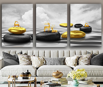 P-45 שלישיית תמונות מחולקות של נוף מודרני עם סלעים ואיילים בזהב