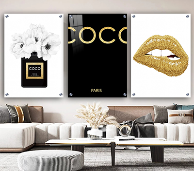 P-55 שלישיית תמונות אופנה יוקרתיות בשילוב בושם שאנל וכיתוב לסלון או חדר שינה