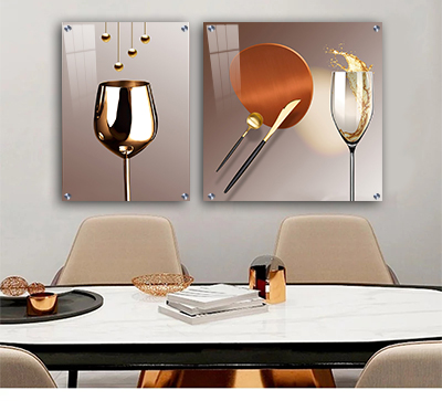 T-23 סט תמונות מודרניות של כוסות יין מעוצבות וסכו"ם בזהב על זכוכית או קנבס